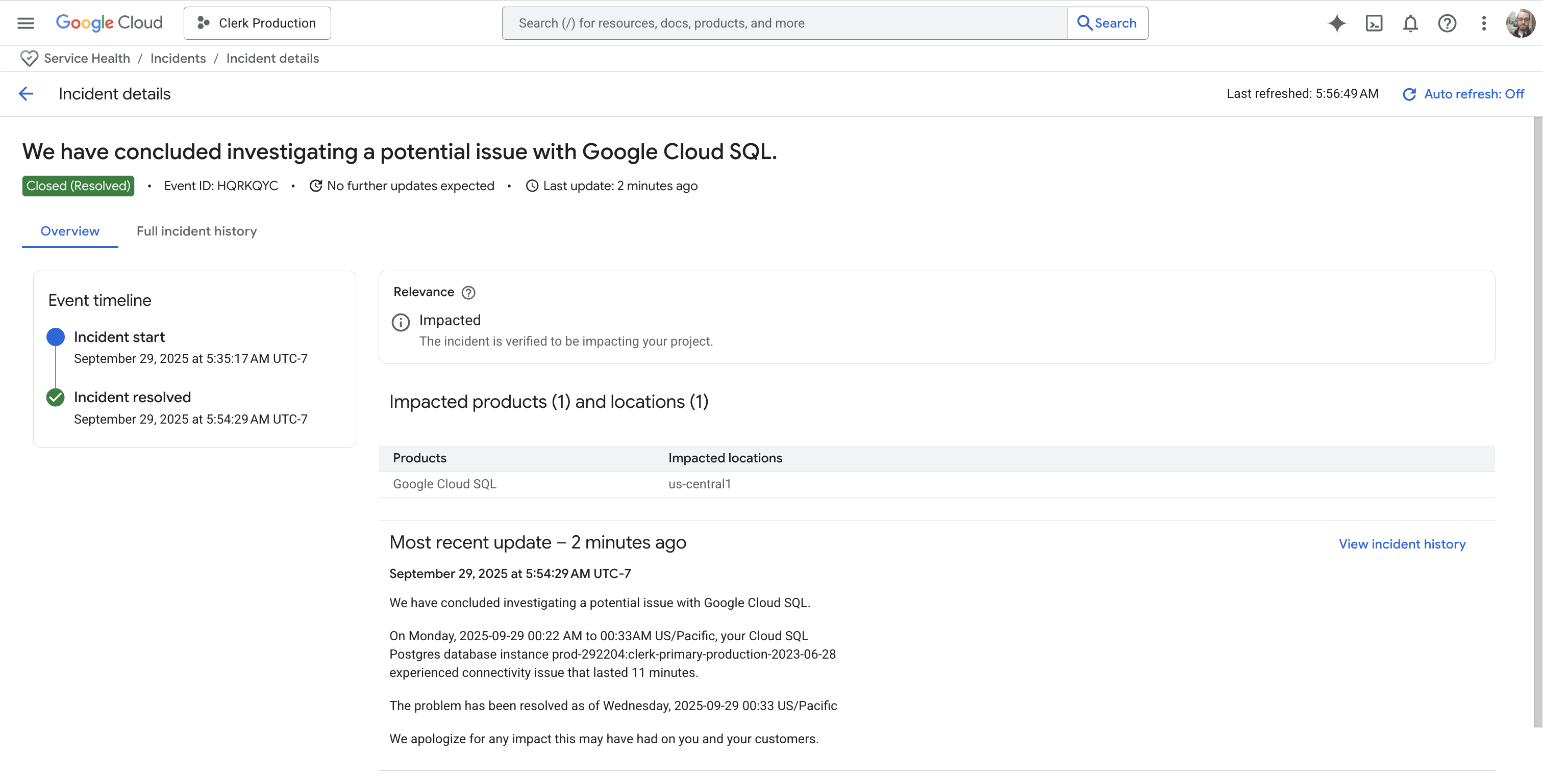 We received confirmation from Google Cloud that our database experienced a connectivity issue for 11 minutes (see screenshot).